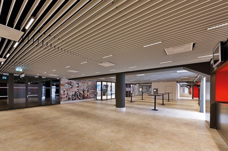 La luz artificial también puede ir bajo el cielo, colgando libremente entre los paneles para lograr una luz rasante con efecto de contraste.