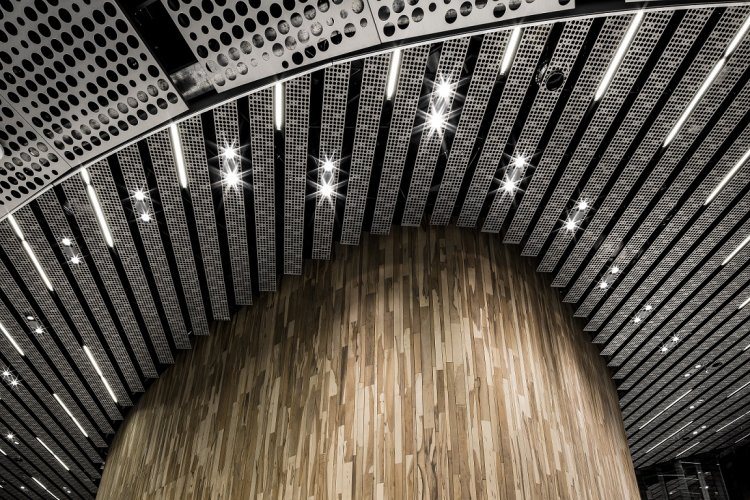El plafón Plank perforado y con tela acústica proporciona un alto coeficiente de absorción acústica (NRC).