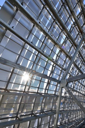 Stripweave es un producto simple, pero que permite lograr resultados muy interesantes. Se trata de cintas o flejes metálicos que van tejiendo entre perfiles tubulares propios del sistema, logrando una imagen final similar a un tejido, pero a gran escala, permitiendo además generar transparencias y opacidades.