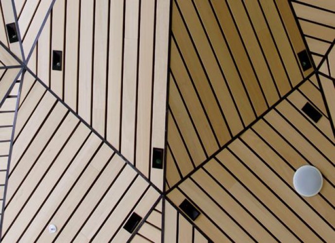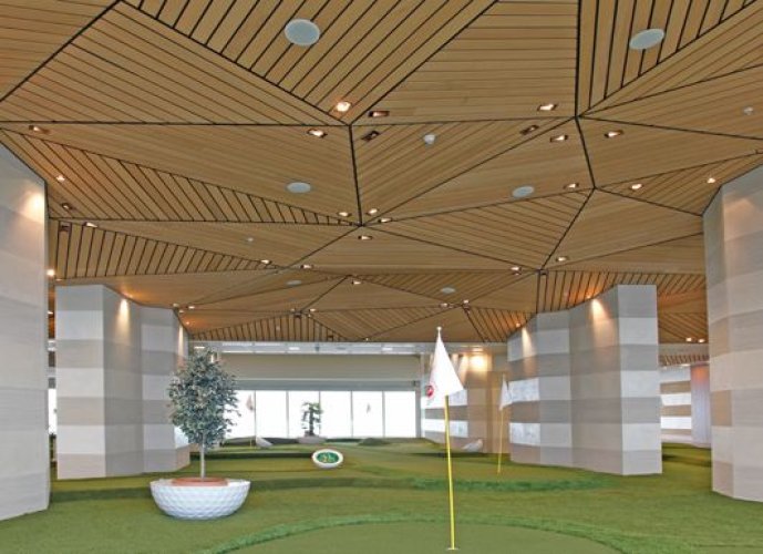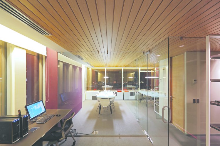Los cielos rasos Woodlines HunterDouglas® estan conformados por paneles metálicos que pueden ser fabricados en los paneles Baffle, “U”, y Timberline.
